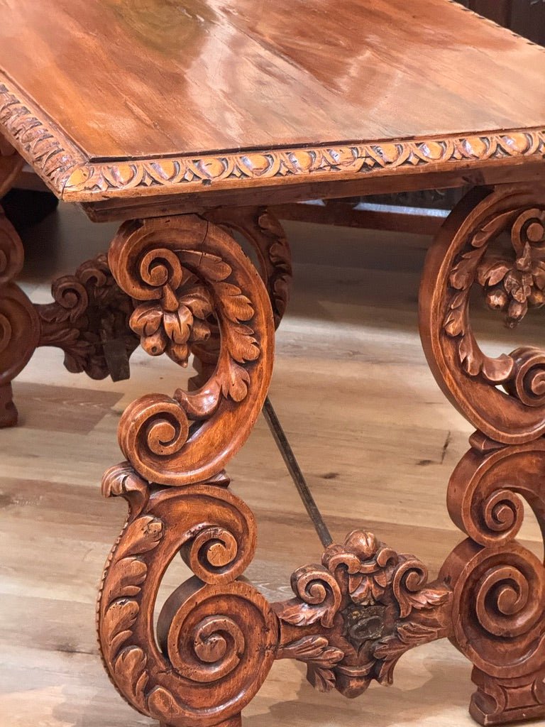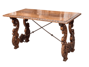 Spanish Baroque center table, late 17th to early 18th century. The rectangular top rests on boldly carved trestle supports with volutes, foliate motifs, and central flowerheads. Joined by an iron X-stretcher, Walnut, with a carved edge molding framing the top. Excellent as a desk. 29.5h. x 49.5” w. x 28” d