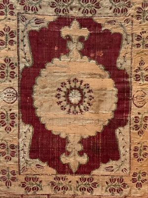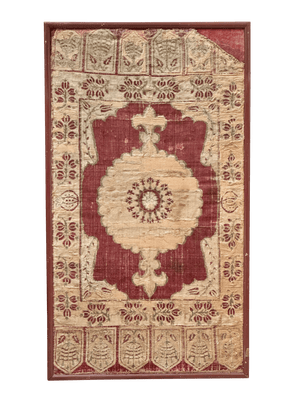 An Ottoman Velvet Cushion Cover, framed, Bursa or Istanbul, 17th/early 18th Century. the raspberry field with a cusped rondel flowerhead anchor medallion enclosed by spandrels of tulips and pale wheat borders of pomegranates and plants, the ends with multiple niches, mounted and framed . 43.25” h. x 24” w.