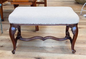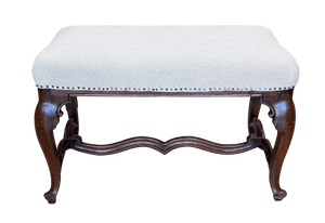 A finely carved Louis XV walnut bench or stool, France, 18th century, featuring cabriole legs, a shaped stretcher, and scrollwork supports. The seat is newly upholstered in natural linen with nailhead trim. Elegant and versatile, it reflects the refined yet fluid lines of the Rococo period.