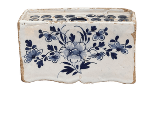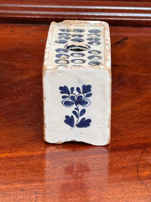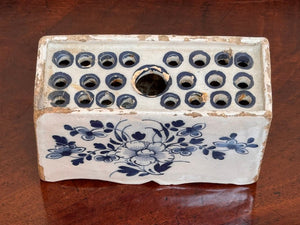 English Delft Flower brick, c. 1760.  Having Asian floral decoration, 22 holes plus a larger central hole for flowers , having a charming ogee molded base.