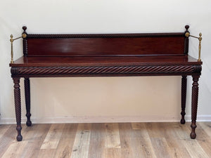 Fine and rare Irish server, sideboard, likely Dublin c. 1790-1810.  Cuban mahogany. The backsplash, apron and legs carved with deep, continuous, diagonal flutes in a uniform spiral pattern.  This table strongly aligns with the work of Mack, Williams & Gibton, a firm renowned for their robust and architecturally inspired Regency furniture.  The sideboard is 86" wide by 27 3/4" deep and stands 51 1/2" in maximum height with the table height being 37 1/4