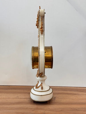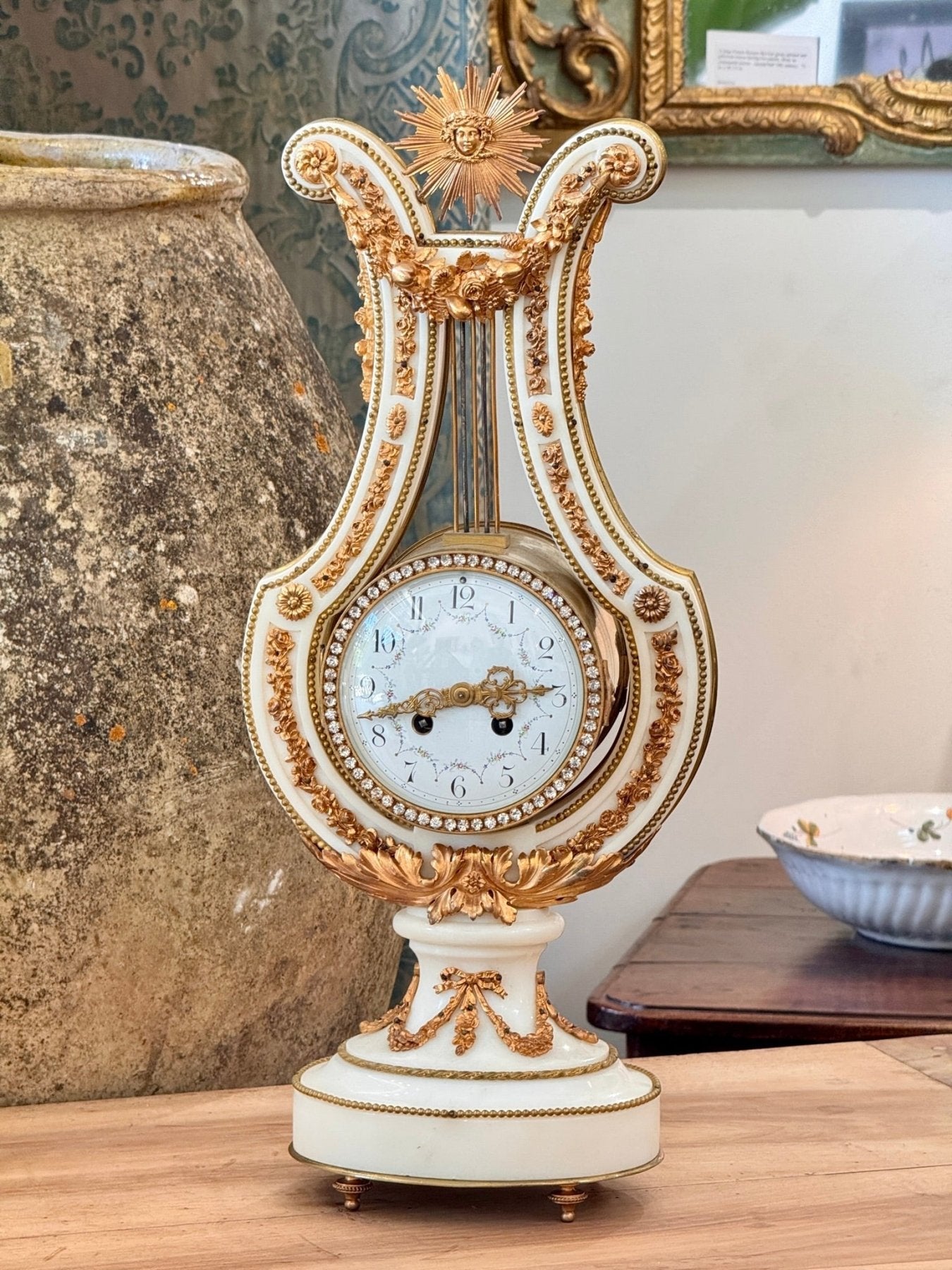 French Louis XVI-Style Gilt Bronze & Marble "Jeweled" Lyre Mantel Clock, late 19th century the case with sun mask surmount above floral swags and laurel mounts, brass 8-day time and strike movement with gridiron pendulum, signed "A.D. Mougin"