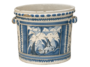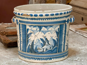 A tin-glazed faience wine cooler from Moustiers, France, hand-painted in cobalt blue with chinoiserie landscape scenes framed by stylized borders. Mid-18th century, with applied side handles and softly aged glaze typical of Provençal craftsmanship. Can be used as a jardiniere or planter. 14” h. x 18” diam.