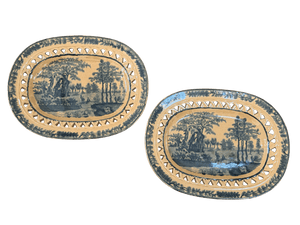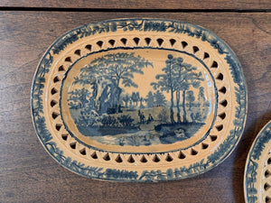 Pair of Davenport Reticulated Chalcedony Small Platters, 1793-1810, English, the oval platters with hand-painted en grisaille ruins of a landscape, with pierced rims, pressed with "Davenport" and an anchor on the backs. w. 10", d. 7-3/4"