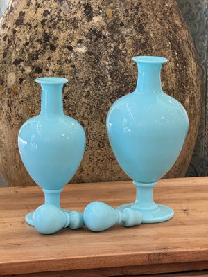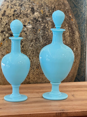 Two 19th Century French blue opaline apothecary jars. Sold as a set. 17” h. x 7” diam, 15” h. x 5” diam.